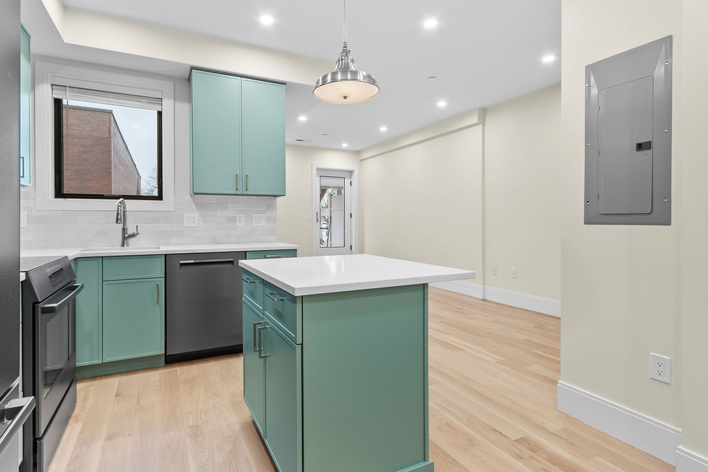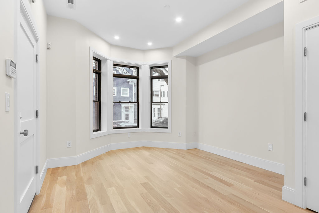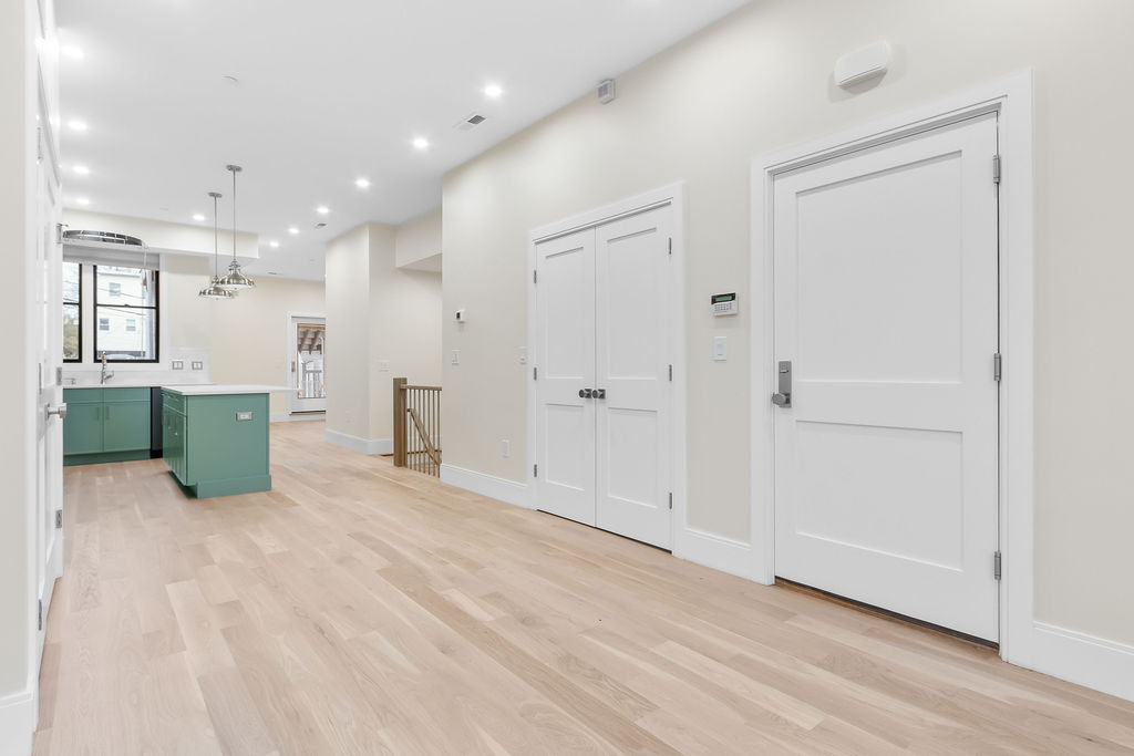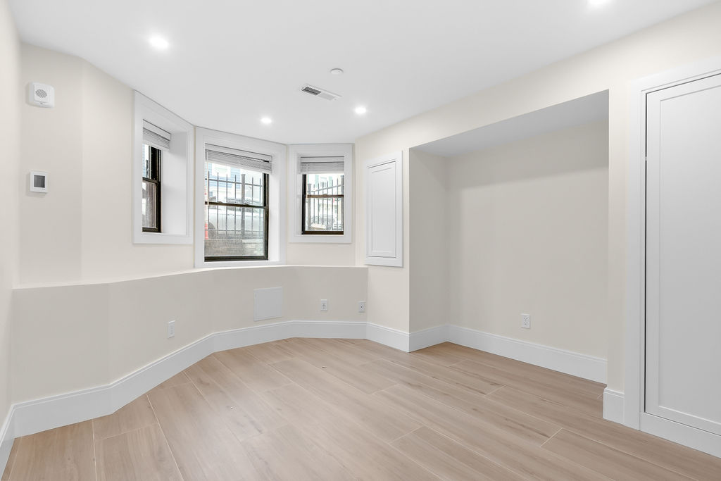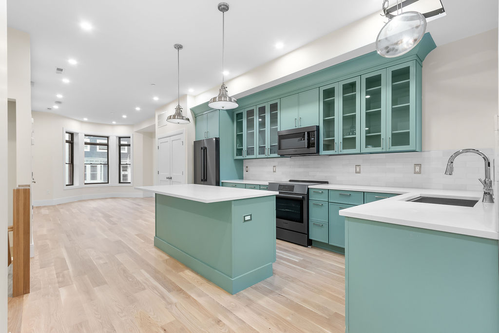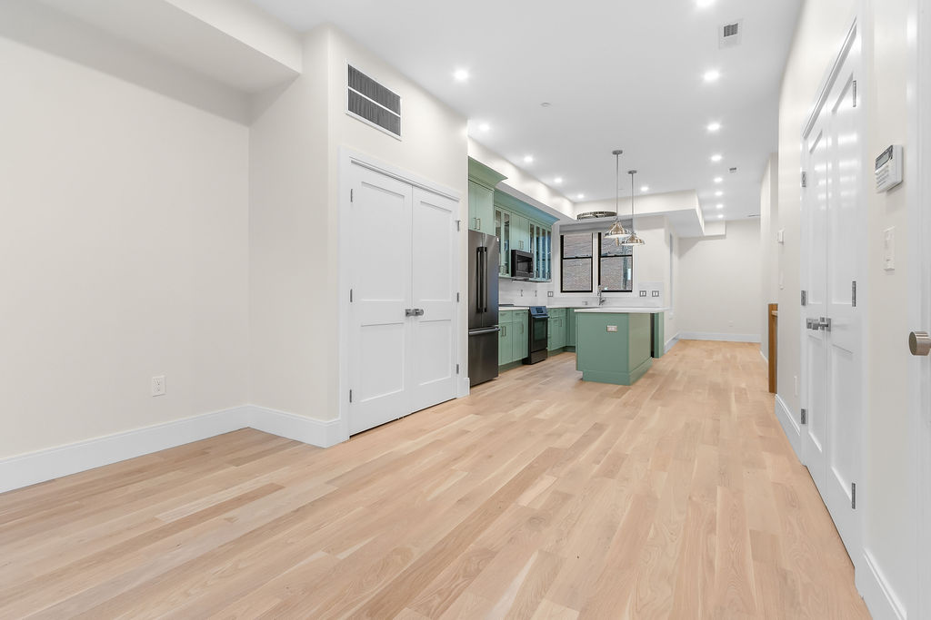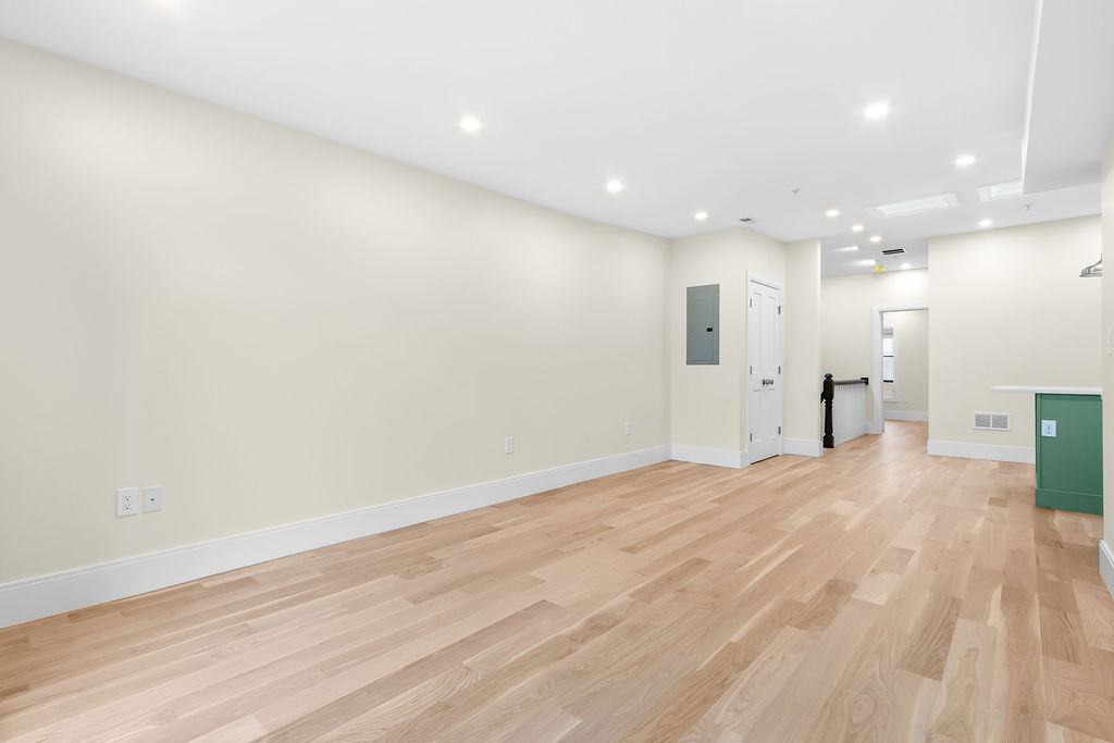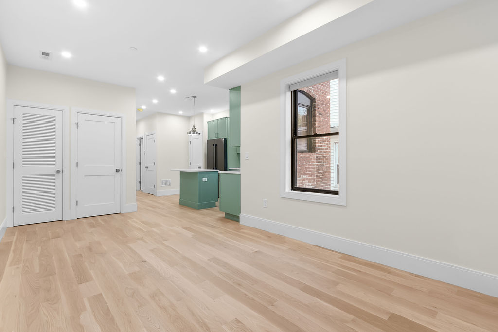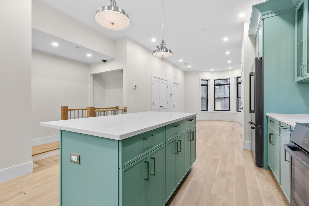 The interior features a bright, open‑concept layout accented by custom wall paneling, refined millwork, and wide‑plank hardwood floors. Within this three‑story multi‑family building, the formal dining area offers an elegant setting for gatherings and entertaining.