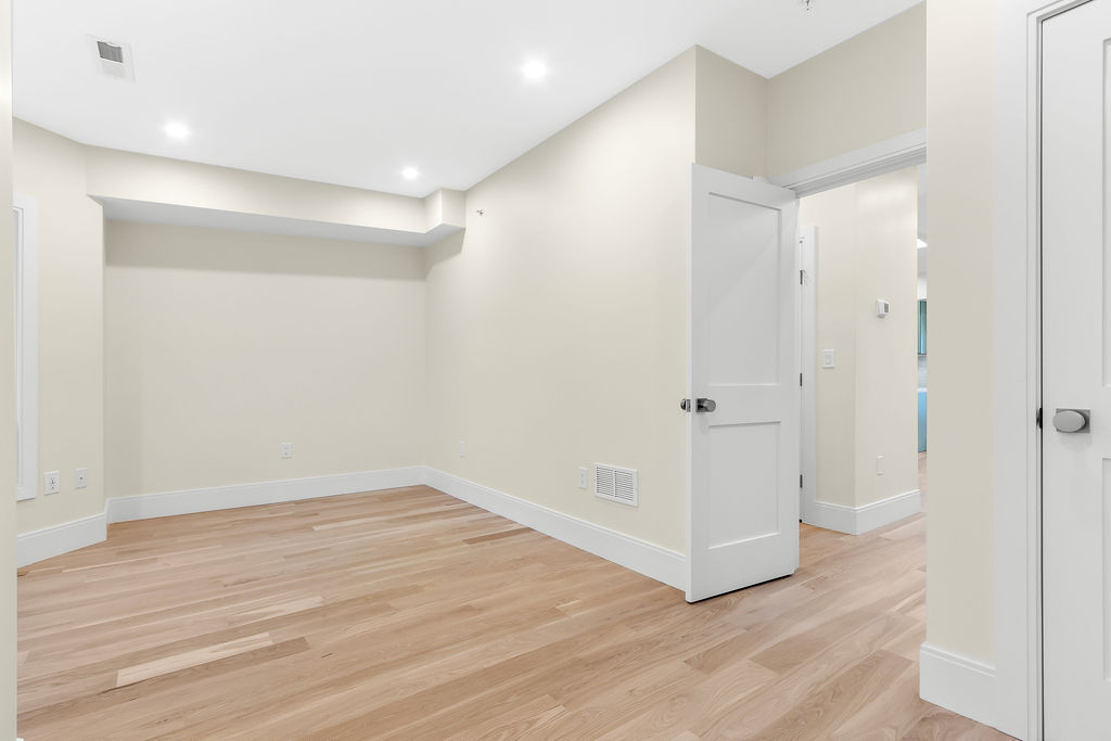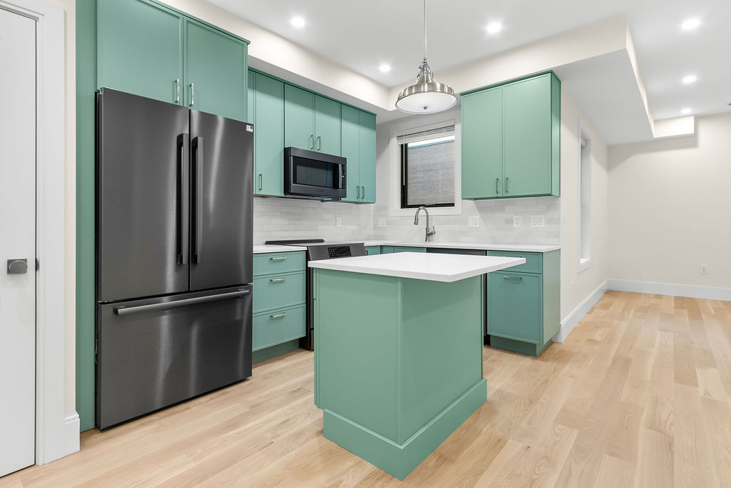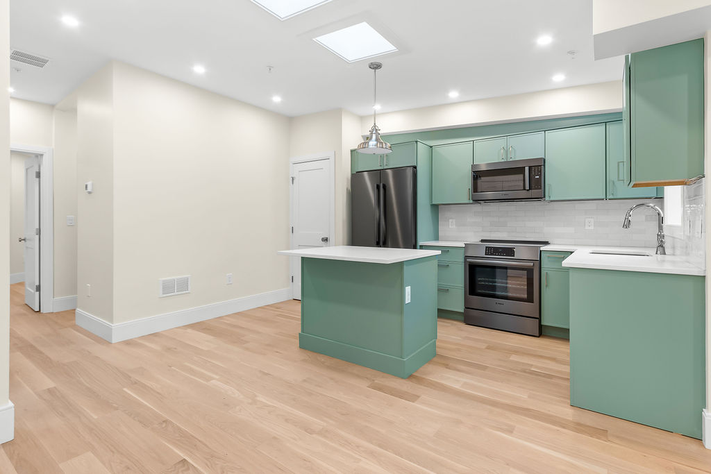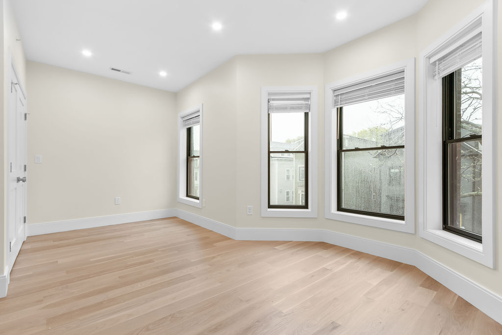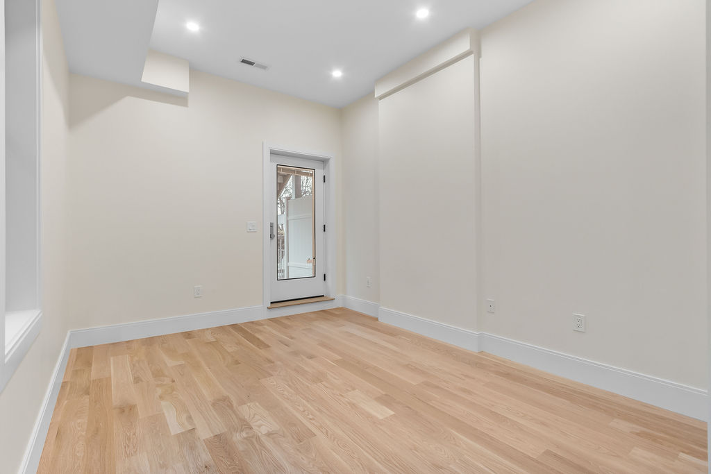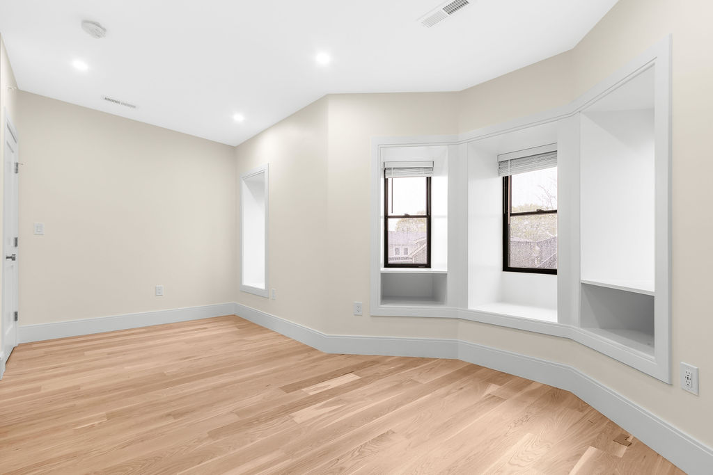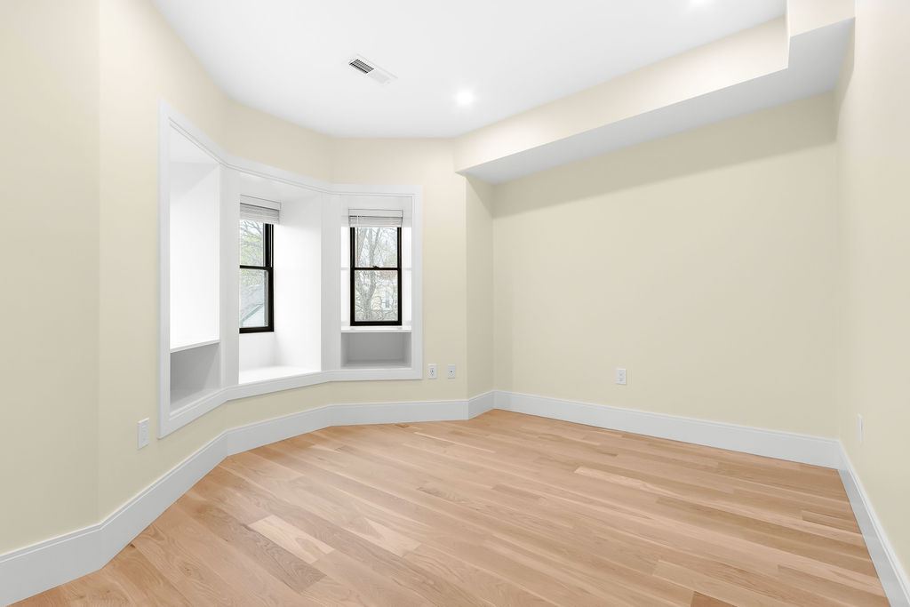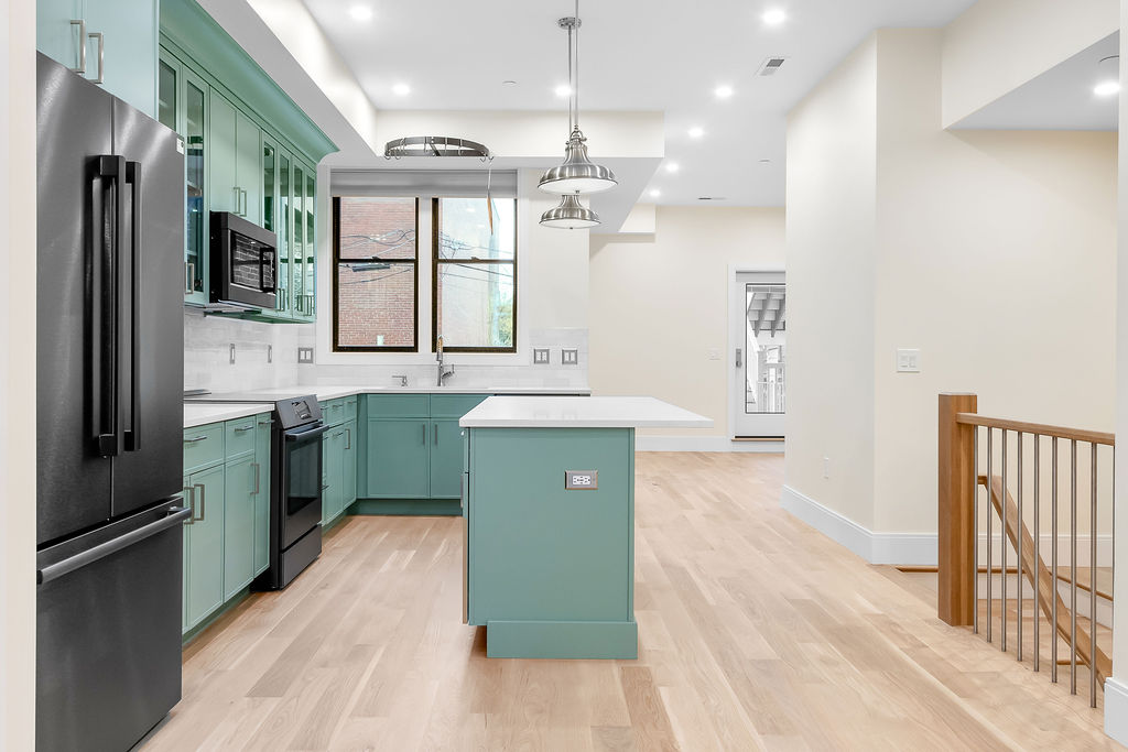 The interior features a bright, open‑concept layout accented by custom wall paneling, refined millwork, and wide‑plank hardwood floors. Within this three‑story multi‑family building, the formal dining area offers an elegant setting for gatherings and entertaining.