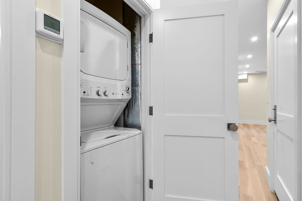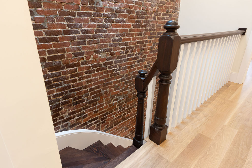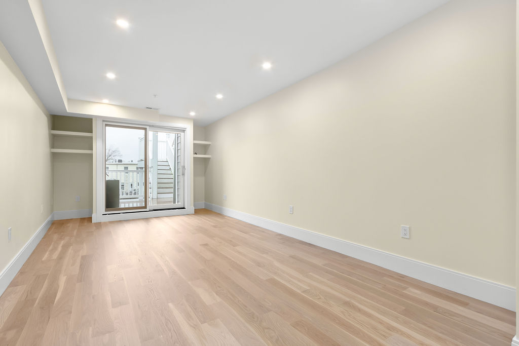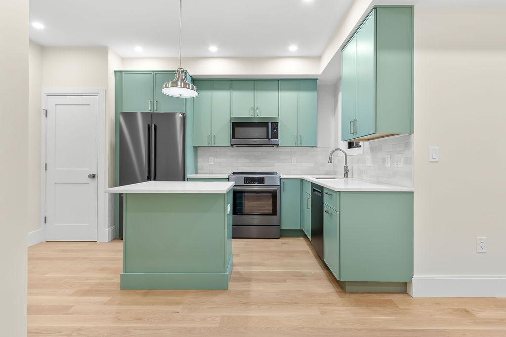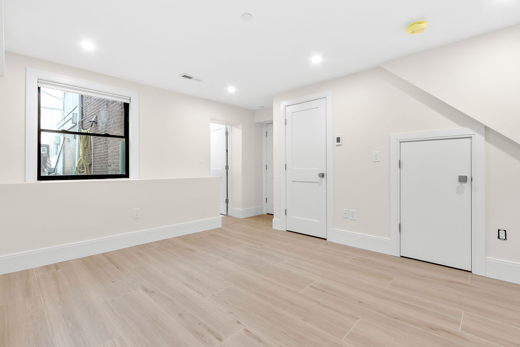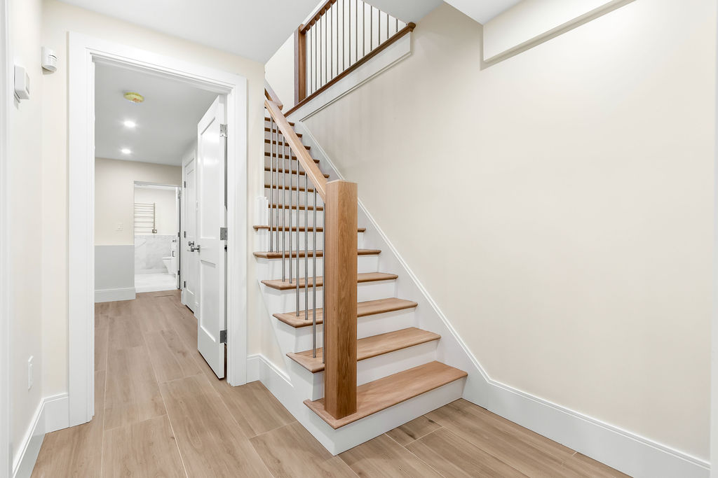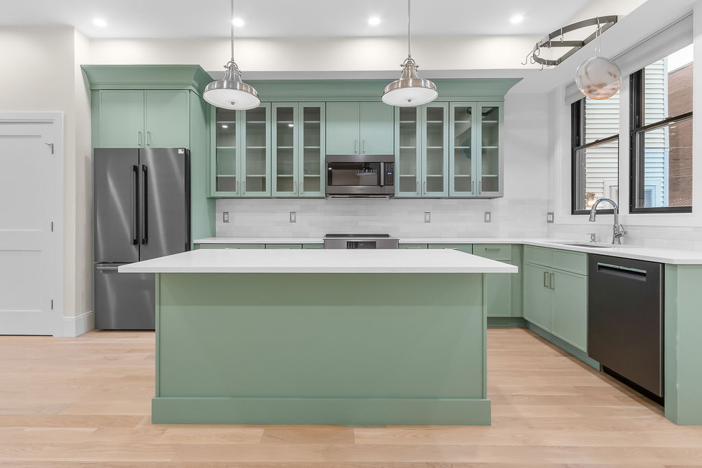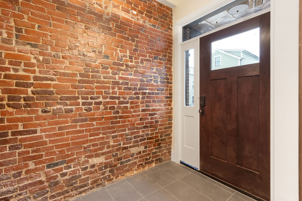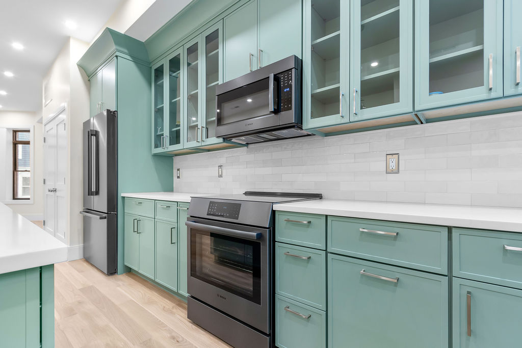 The interior features a bright, open‑concept layout accented by custom wall paneling, refined millwork, and wide‑plank hardwood floors. Within this three‑story multi‑family building, the formal dining area offers an elegant setting for gatherings and entertaining.